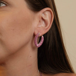 BRINCO PIZZA ZIRCONIA GRANDE CRAVEJADA COM ZIRCONIA BAGUETE ROSA BANHADO A OURO 18K