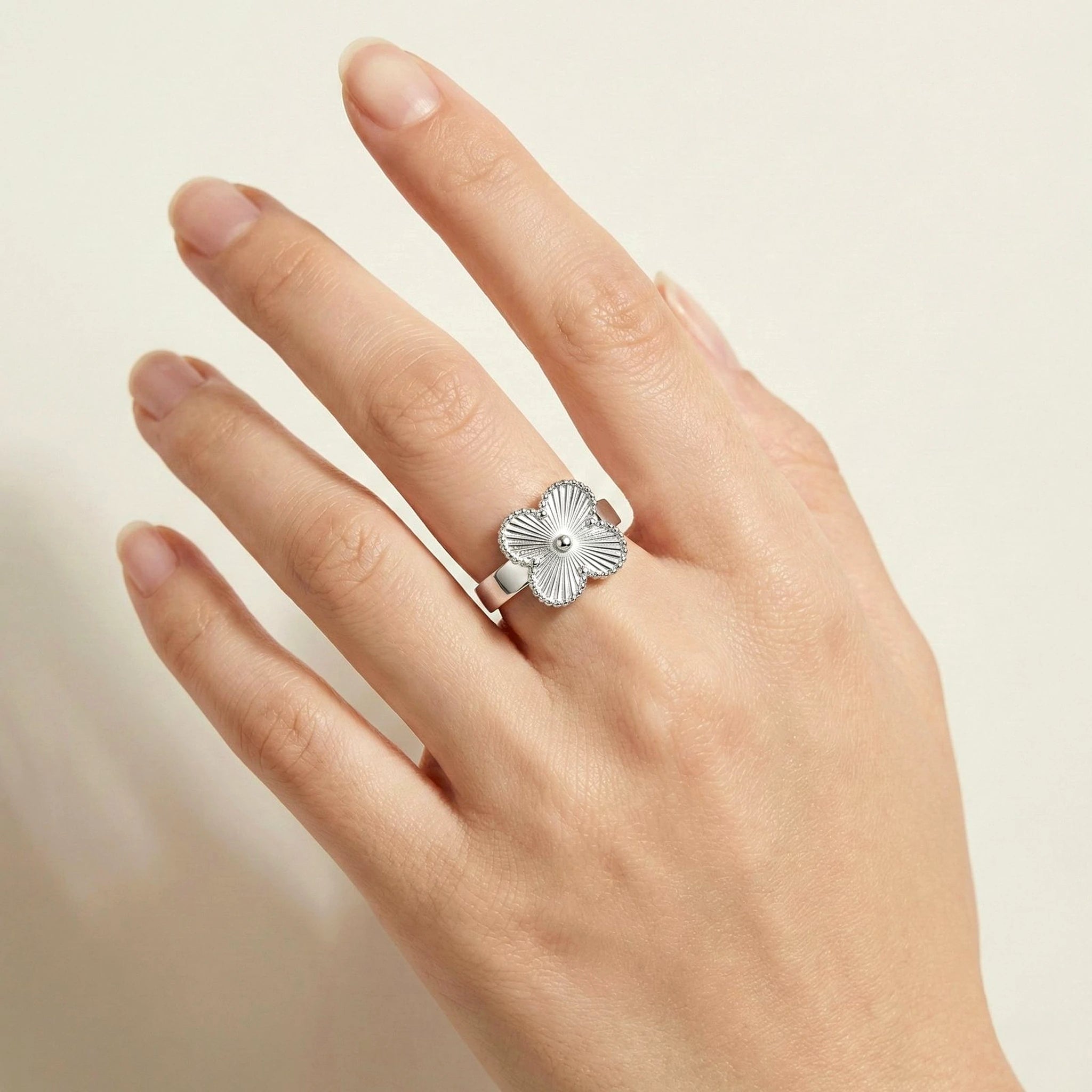 O acabamento polido em prata 925 realça o desenho detalhado do trevo, criando um brilho sutil e refinado. Seu design equilibrado permite o uso tanto como peça principal quanto em combinações com outros anéis, adaptando-se a diferentes estilos e momentos.
