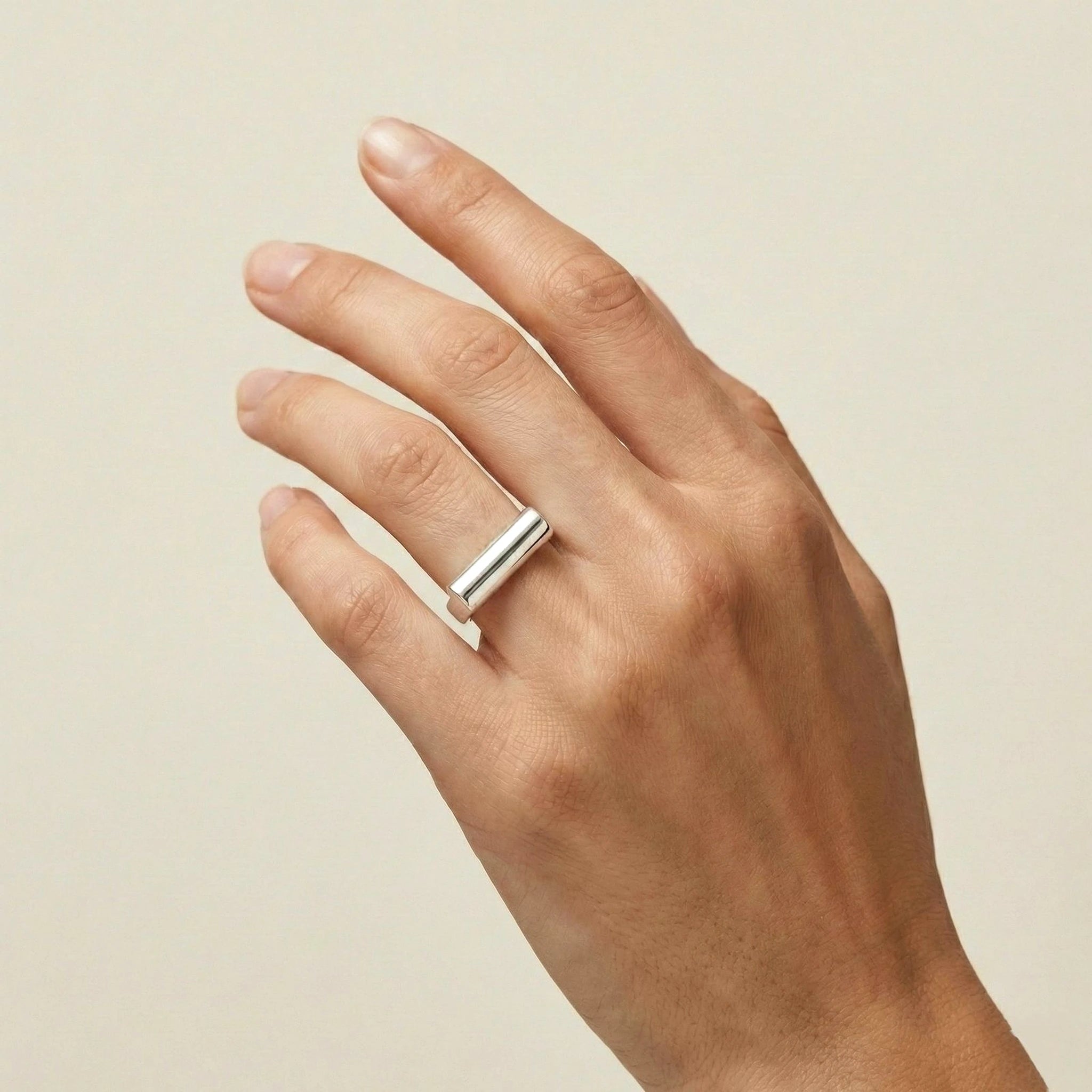 O formato tubular confere presença elegante sem excessos, enquanto o acabamento polido em prata 925 garante brilho suave e aparência refinada. Seu design permite combinações fáceis com outros anéis ou o uso solo como ponto de destaque, adaptando-se a diferentes estilos e ocasiões.