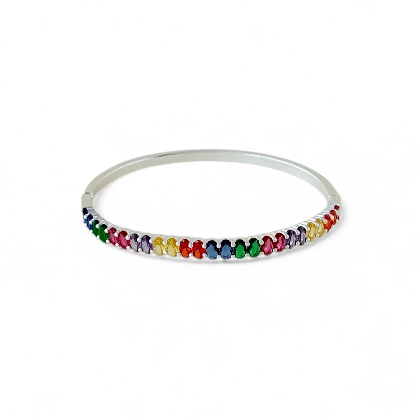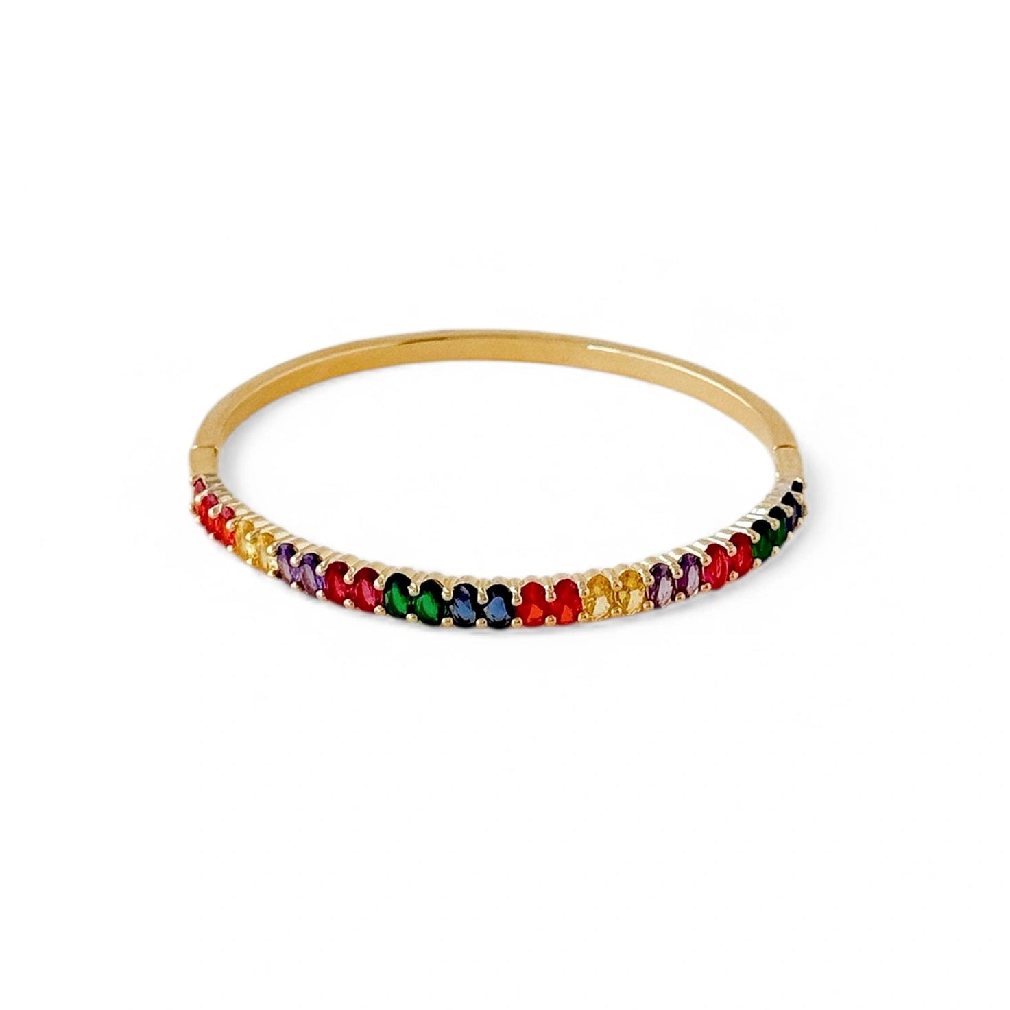 • Estilo/formato: bracelete rígido com frente cravejada de zircônias coloridas