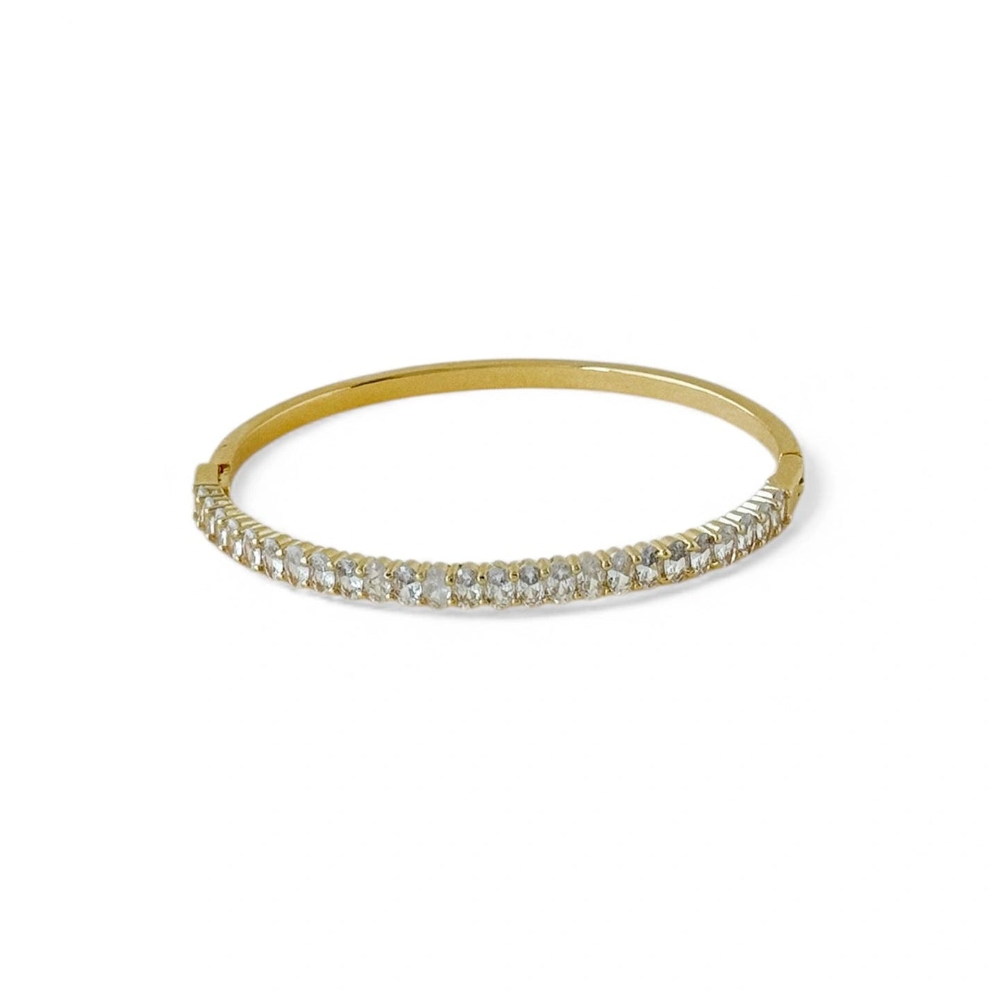• Estilo/formato: bracelete rígido com frente cravejada de zircônias transparentes