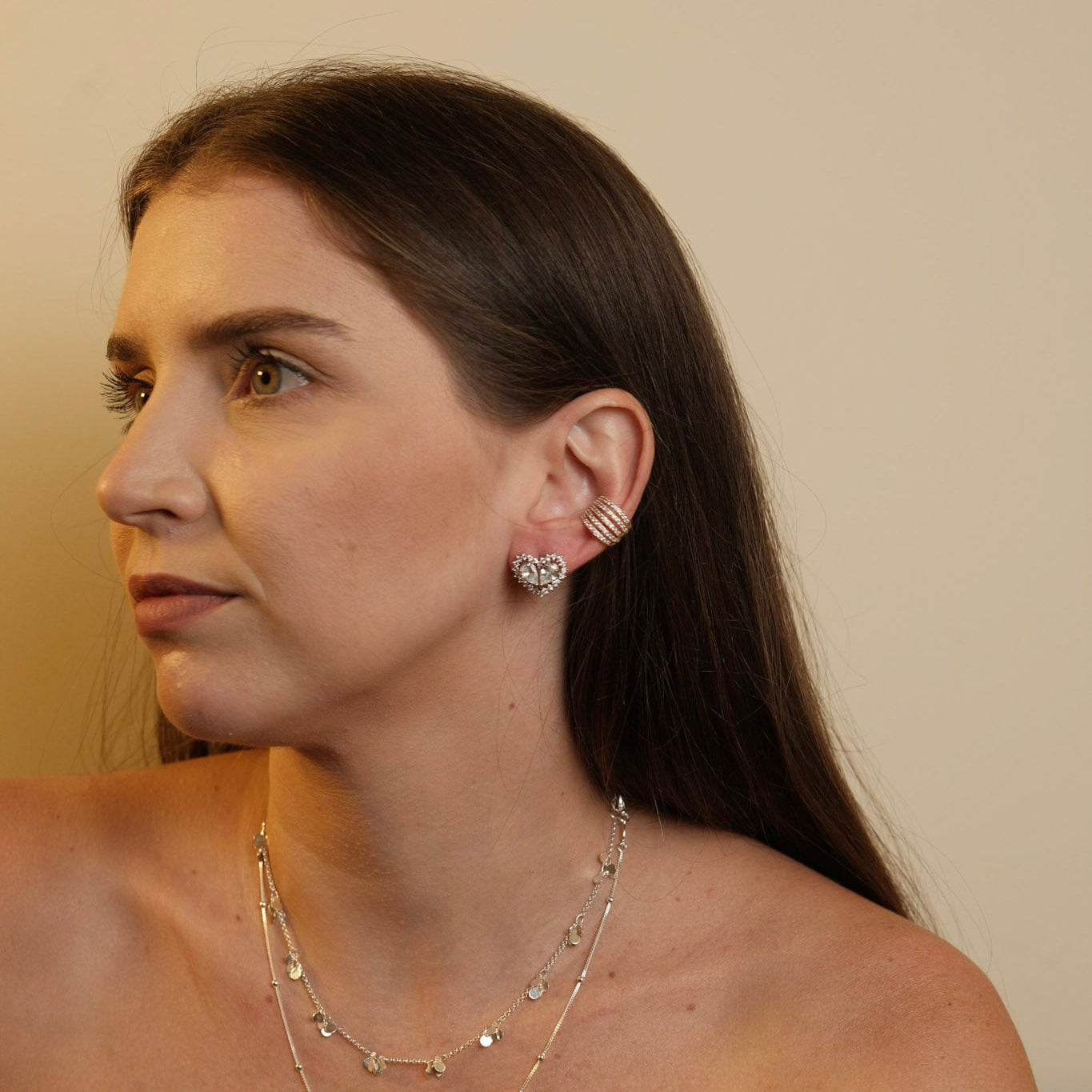 BRINCO CORAÇÃO ZIRCONIAS CRAVEJADAS E DUAS GOTAS BANHADO A PRATA 925