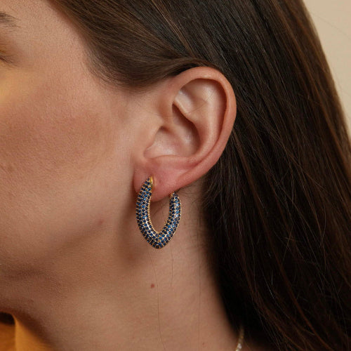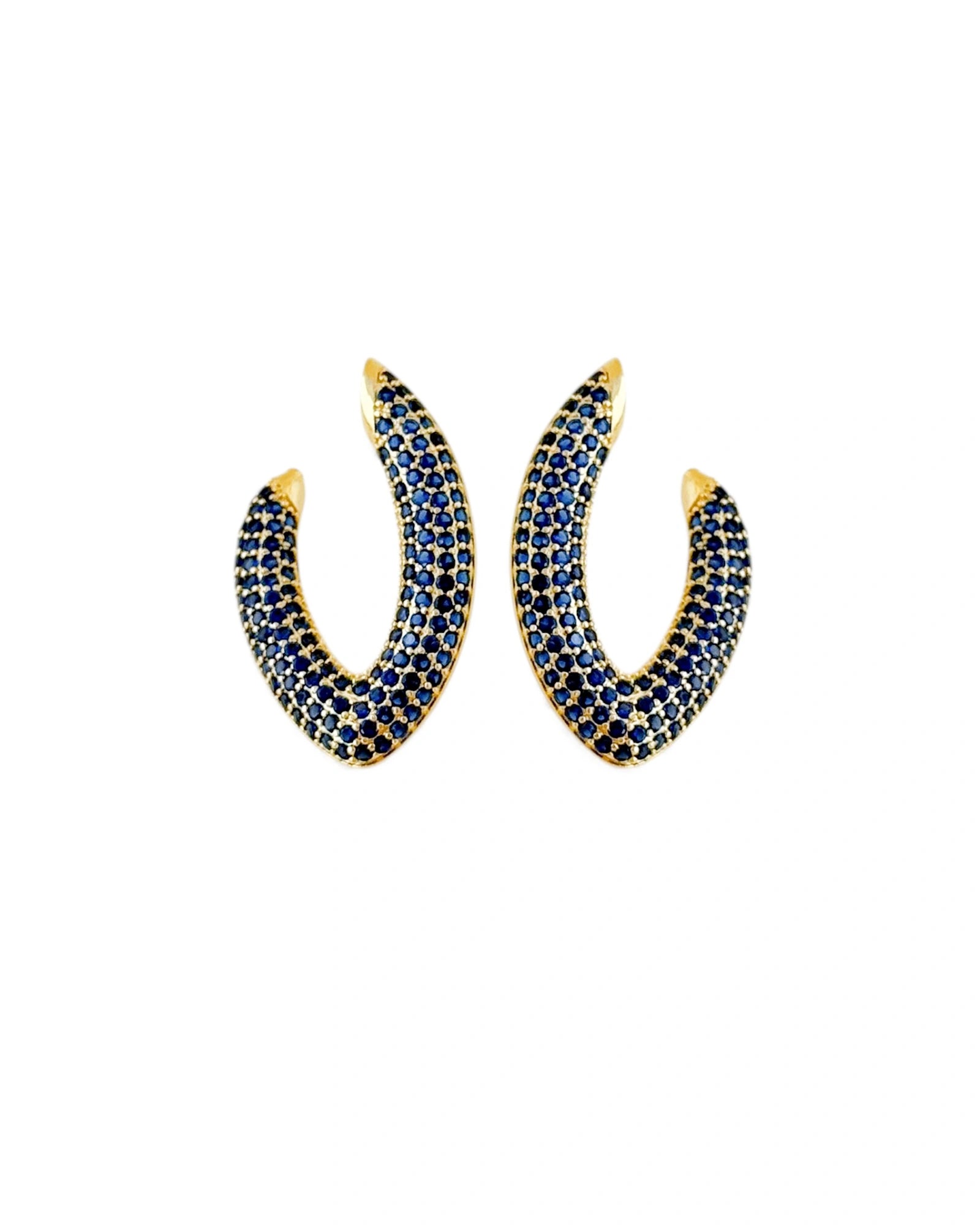 • Estilo/formato: brinco médio em formato de V cravejado com zircônias azuis