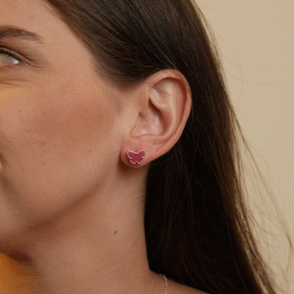 O Brinco Pequeno Borboleta Rosa banhado a prata 925 é perfeito para quem busca um toque de cor sofisticado na rotina. O tom rosa vibrante cria um contraste elegante com o brilho da prata, trazendo frescor e personalidade ao look sem perder a delicadeza.