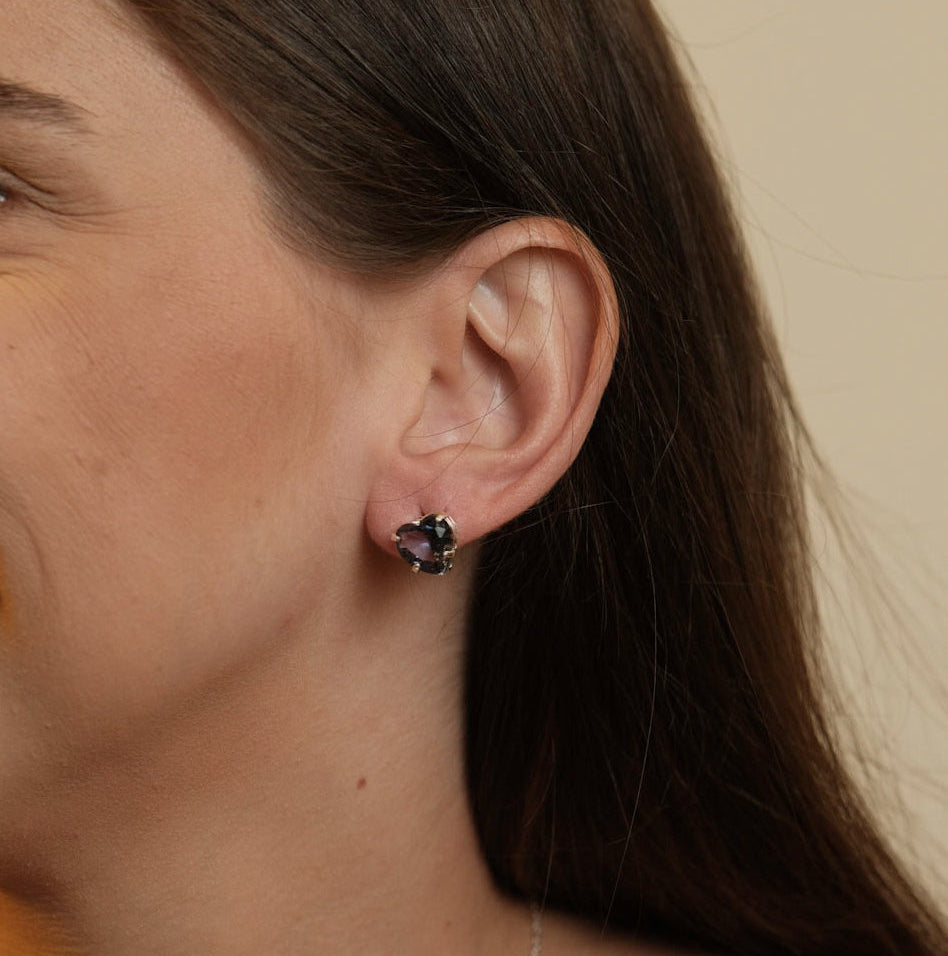 A intensidade do azul escuro em forma de coração dá a este brinco pequeno com pedra de vidro banhado a prata 925 da UNA Semijoias e Aço um charme sofisticado e minimalista. As facetas da pedra refletem a luz de maneira elegante, enquanto as garrinhas em prata desenham um contorno delicado ao redor do coração.