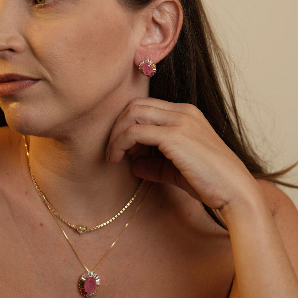 Este brinco pizza com zircônia grande colorida e halo de zircônias baguete rosa e multicoloridas, banhado a ouro 18k da UNA Semijoias e Aço, é a peça perfeita para quem ama semijoias finas com presença de joia de luxo. A pedra central em tom rosa intenso ganha ainda mais destaque com o contorno de baguetes coloridas, criando um efeito sofisticado, vibrante e super feminino.