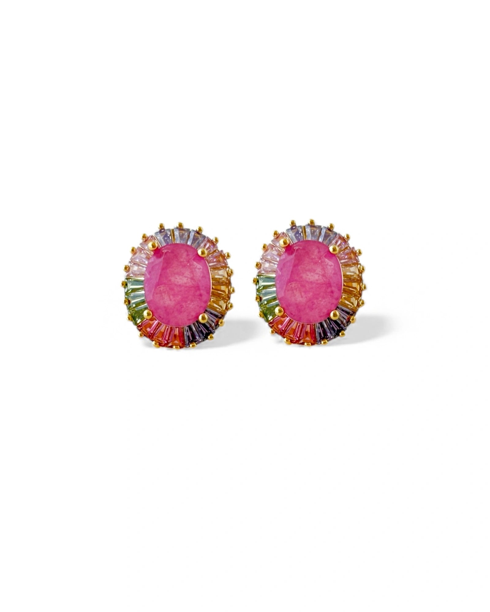 • Estilo/formato: brinco pizza com zircônia central rosa e halo de zircônias baguete coloridas
