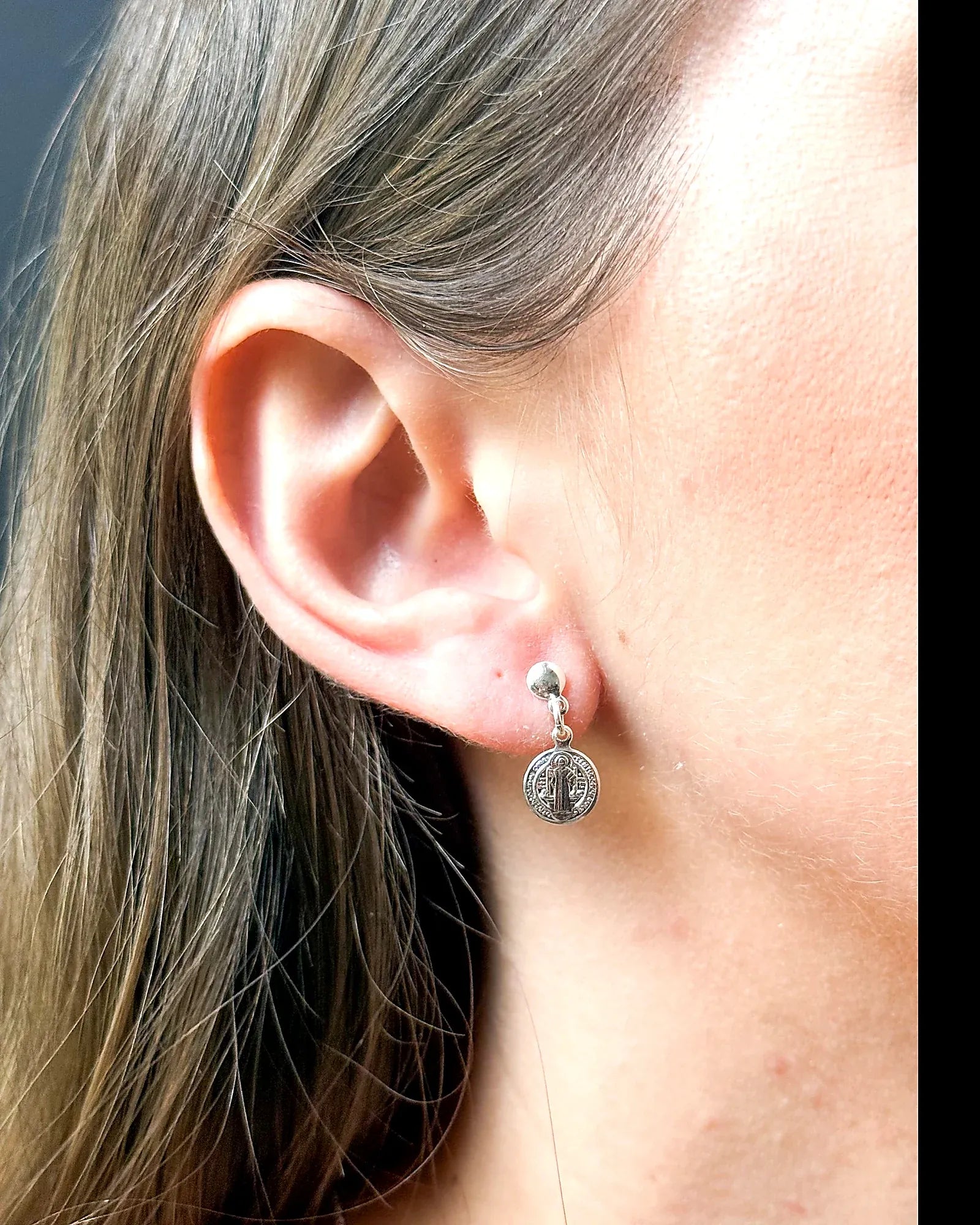 Há quem goste de demonstrar a fé em detalhes discretos, e esse brinco São Bento banhado a prata 925 da UNA Semijoias e Aço foi feito exatamente para isso. A medalha pequena e delicada traz o símbolo de São Bento em destaque, pendurada em uma base lisa e minimalista, criando um brilho prateado elegante próximo ao rosto.