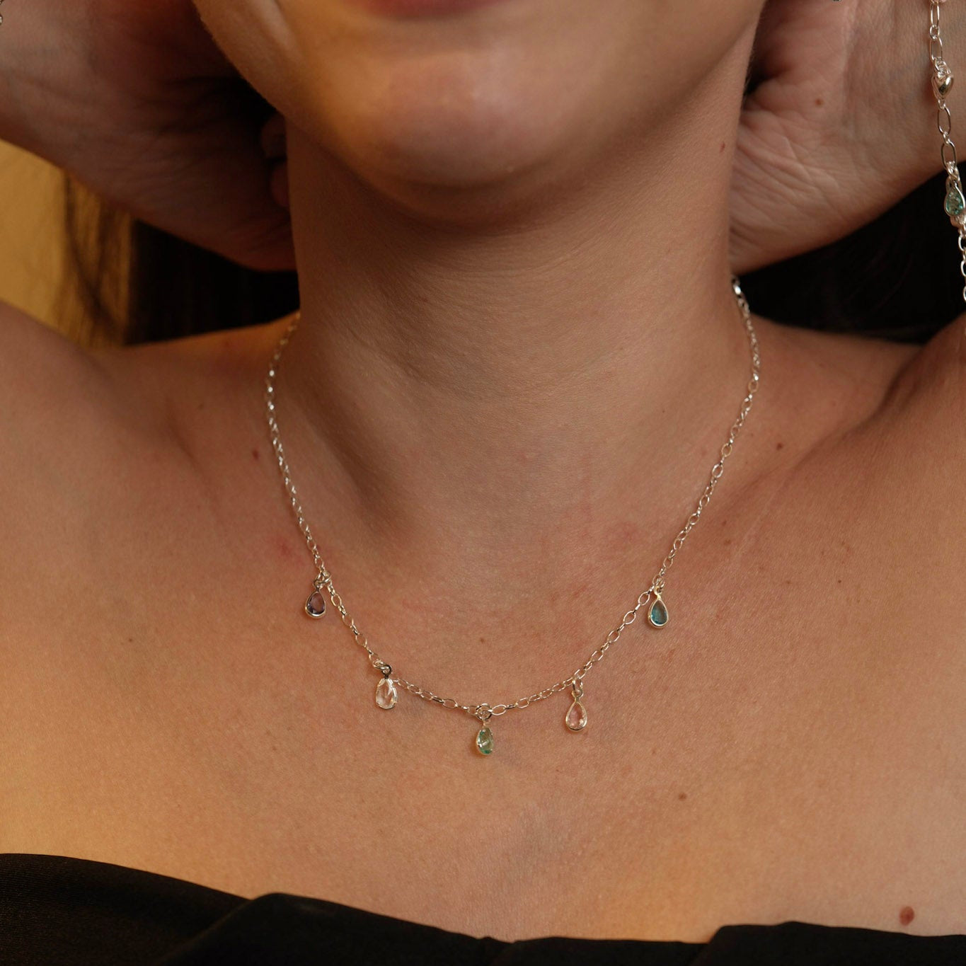 • Nome: Colar com Pingentes Gotas Coloridos Banhado a Prata 925