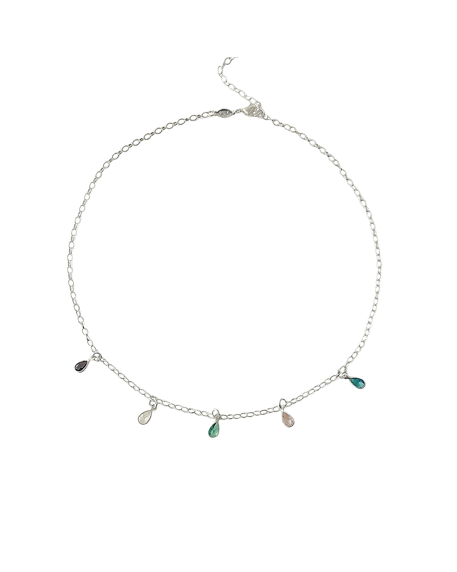 Pequenas gotas de cor distribuídas na corrente fazem deste colar banhado a prata 925 da UNA Semijoias e Aço um detalhe leve e alegre para o dia a dia. Os pingentes em forma de gota aparecem em diferentes tons suaves, criando um movimento delicado que ilumina o colo sem roubar a cena.