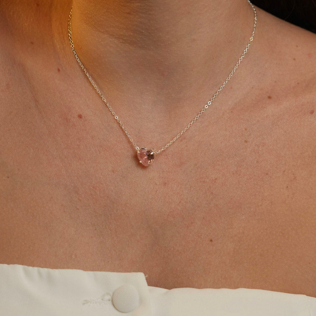 A delicadeza da pedra de vidro rosa claro em formato de coração encontra o brilho do metal banhado a prata 925 neste colar da UNA Semijoias e Aço. O pingente, com facetas suaves, reflete a luz de forma sutil, enquanto o contorno em prata confere um acabamento refinado que destaca o colo com elegância.