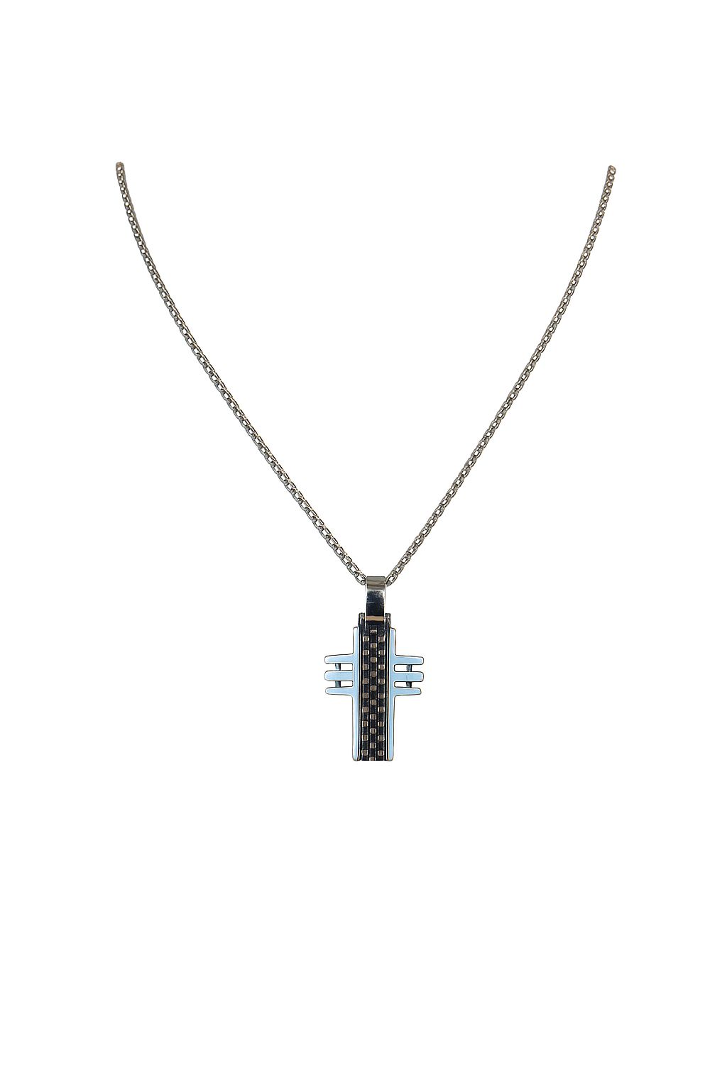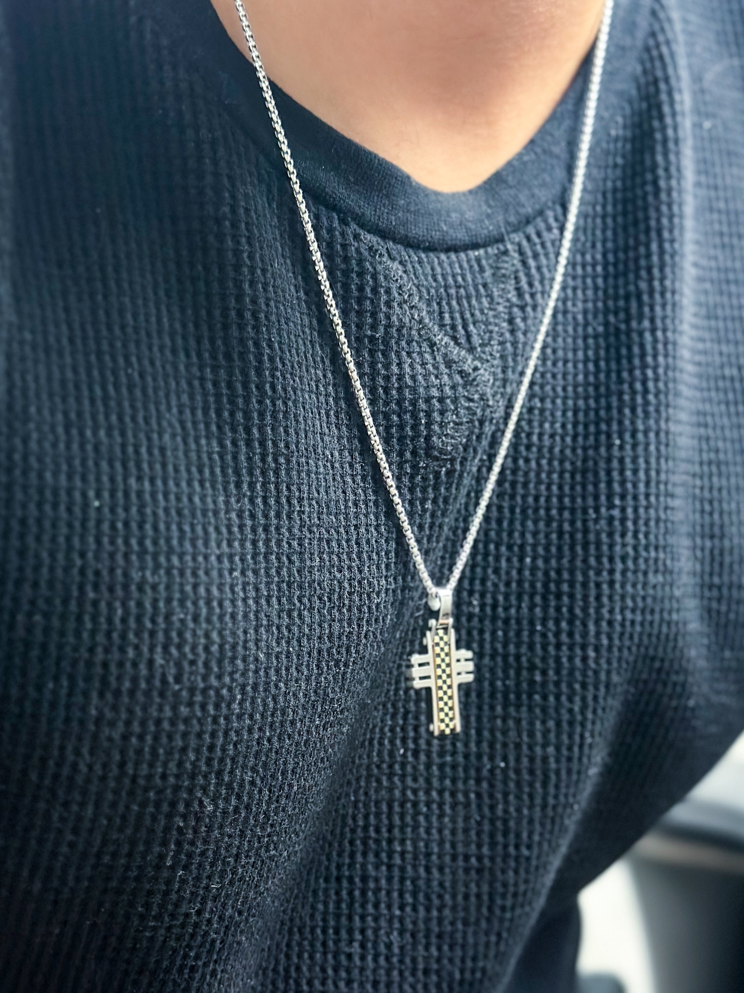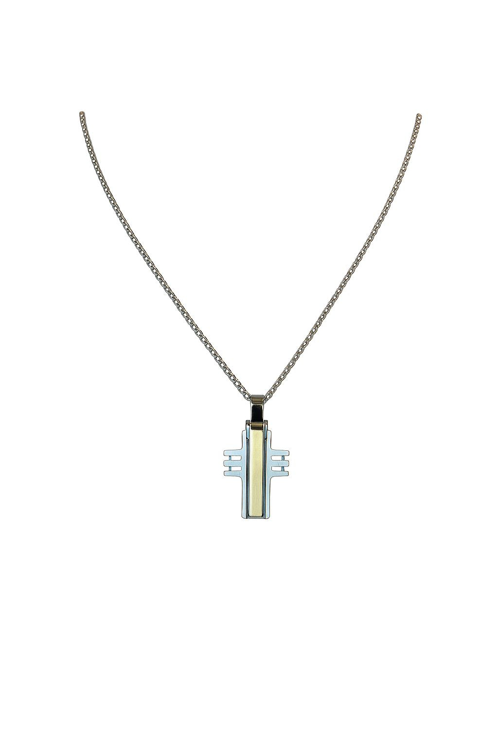 colar de aço masculino com cruz prateada e detalhe dourado da una semijoias e aço