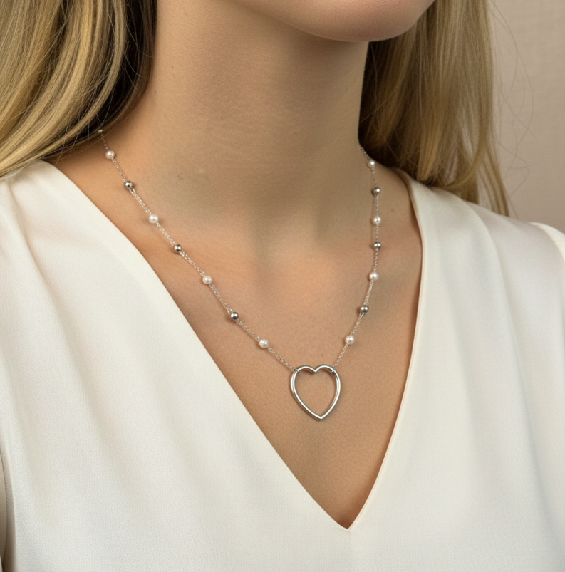 COLAR PINGENTE DE CORAÇÃO COM PEROLAS BANHADO A RÓDIO