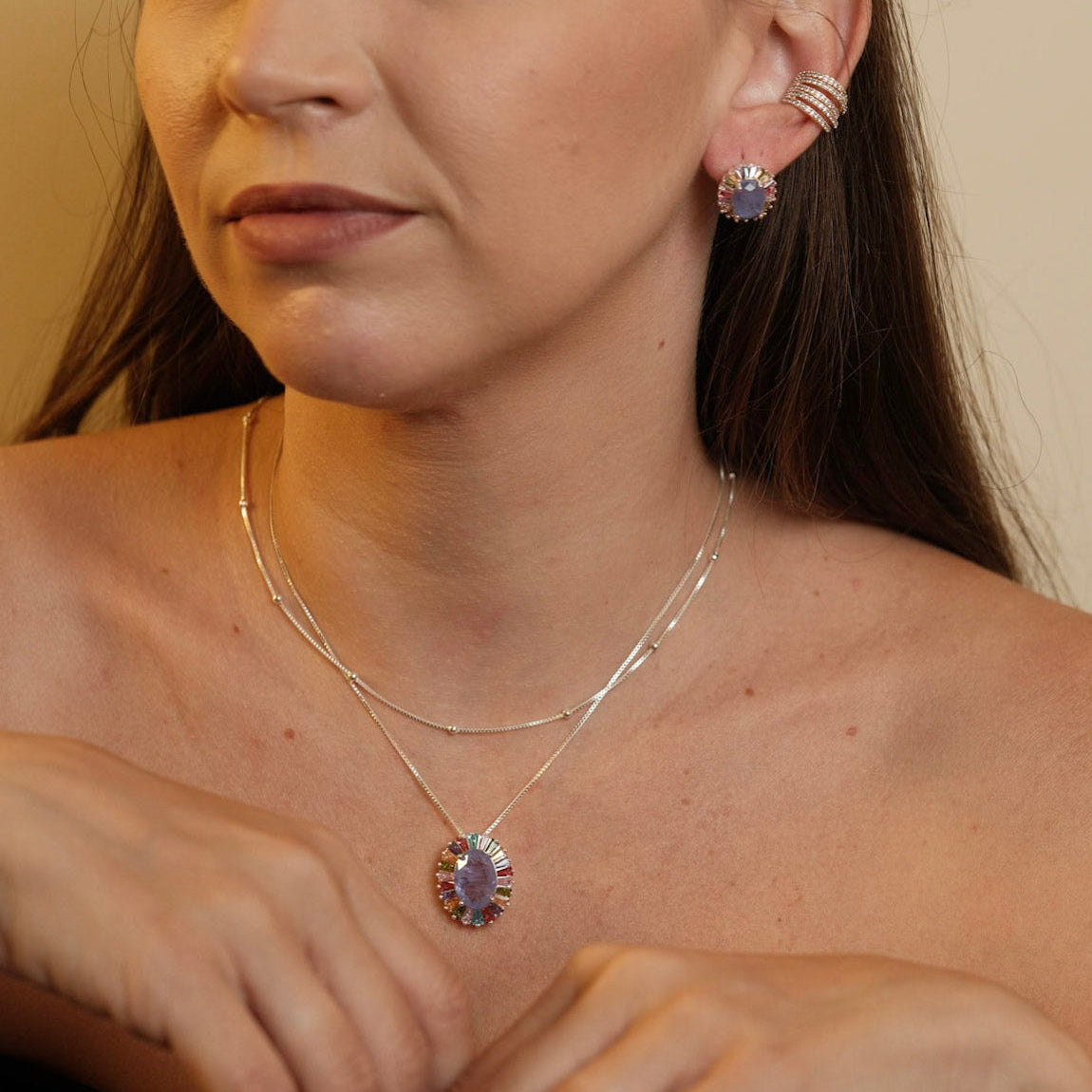 Este colar pingente pizza com zircônia grande colorida e halo de zircônias baguete roxas e multicoloridas, banhado a prata 925 da UNA Semijoias e Aço, é a peça ideal para quem ama semijoias finas com presença marcante. A pedra central roxa em destaque, cercada por baguetes coloridas, cria um efeito sofisticado e vibrante que ilumina o colo com personalidade.
