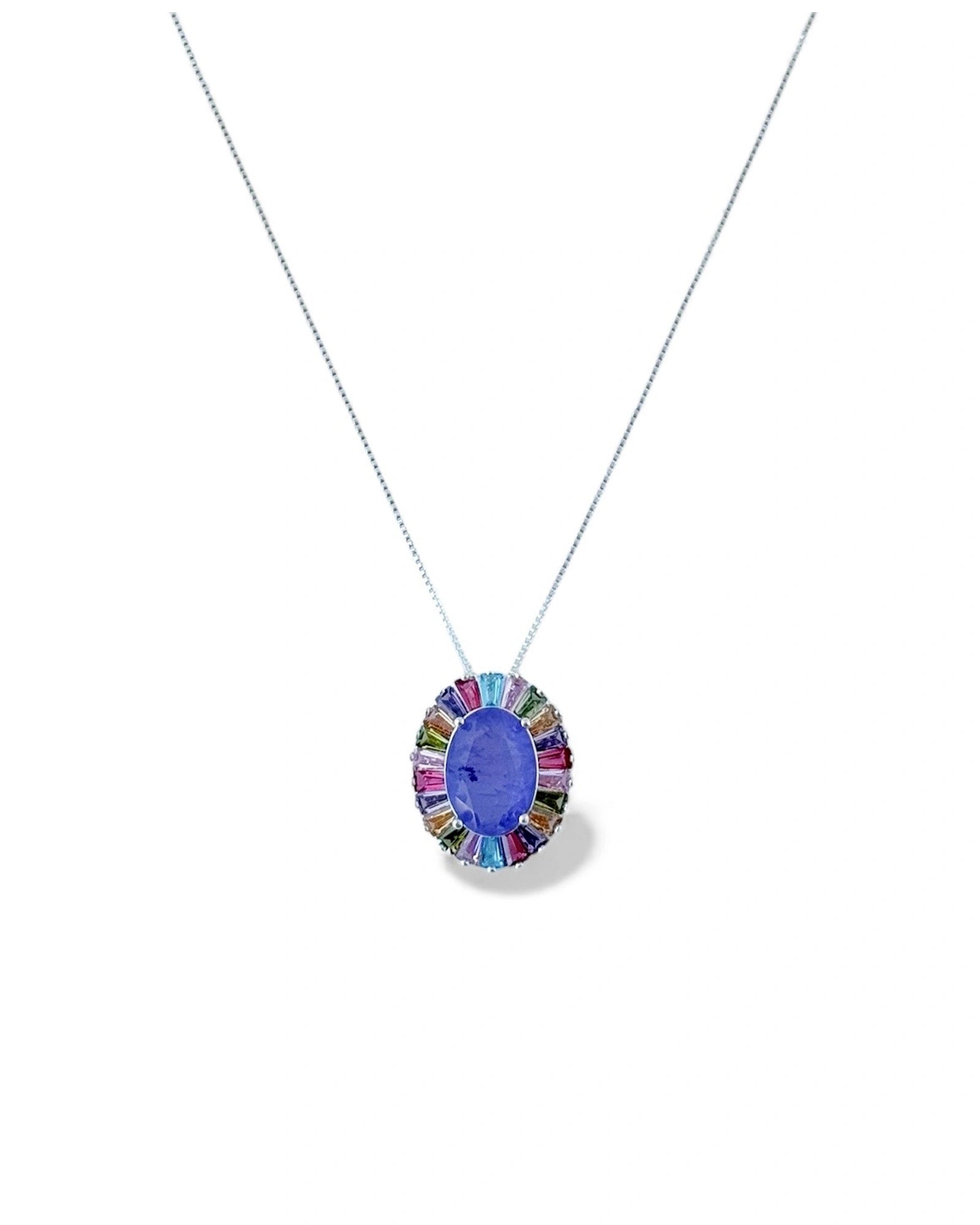• Estilo/formato: colar com pingente pizza de zircônia roxa central e baguetes coloridas ao redor