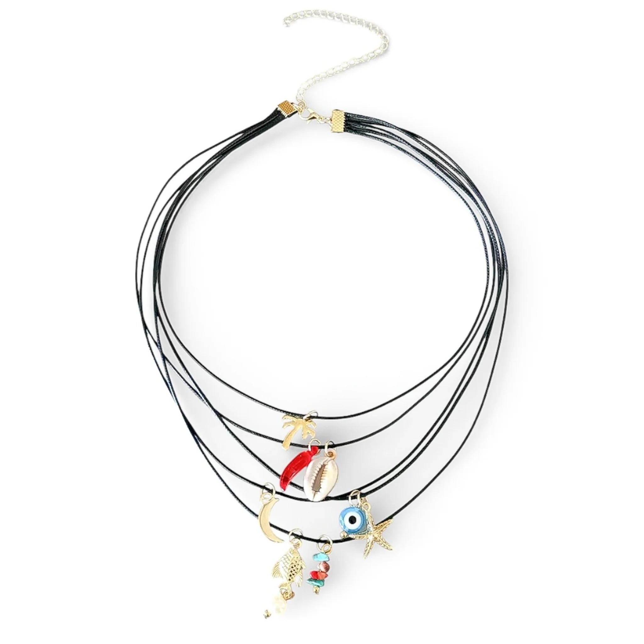 O colar Pingentes de Verão da UNA Semijoias e Aço é a bijuteria fina perfeita para quem ama acessórios cheios de significado. Os fios pretos criam uma base moderna e leve, enquanto os pingentes dourados e coloridos – como olho grego, búzios, conchas, estrela-do-mar, lua e símbolos tropicais – traduzem o mood de férias e boas energias.