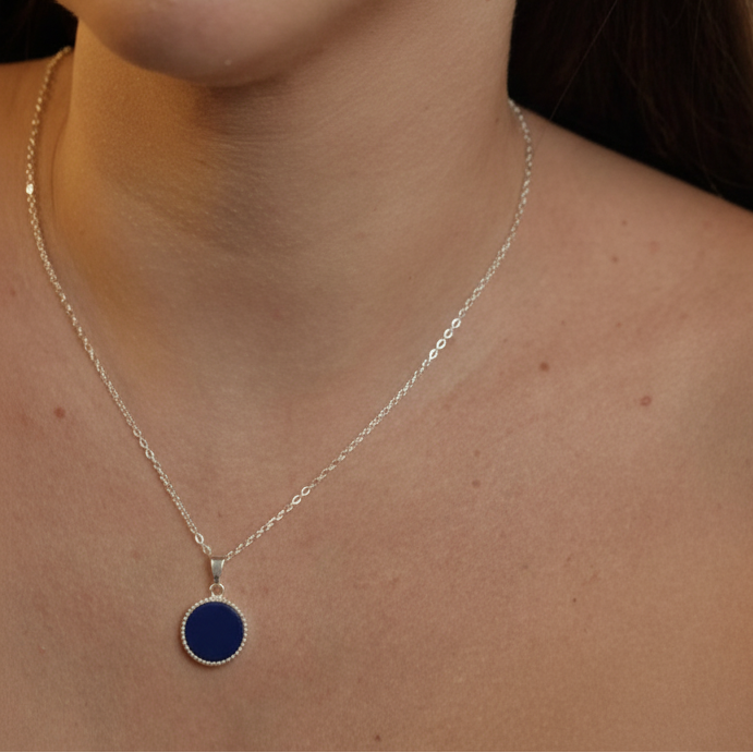 O colar redondo azul banhado a prata 925 da UNA Semijoias e Aço é aquela peça que transforma o visual com um toque de cor sofisticada. O pingente circular em azul intenso contrasta com a corrente prateada de acabamento fino, criando um efeito elegante e moderno, perfeito para quem gosta de acessórios discretos, mas cheios de personalidade.
