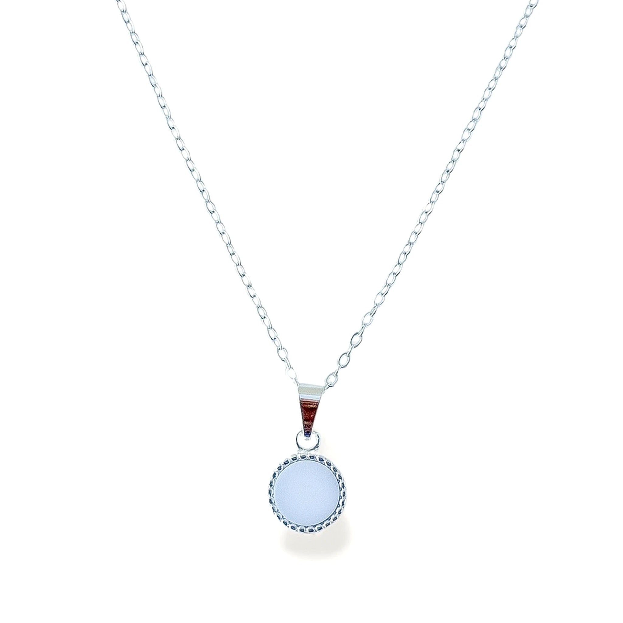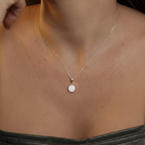 O colar redondo pequeno branco banhado a prata 925 da UNA Semijoias e Aço é aquele tipo de peça que combina com todos os looks e todas as fases. O pingente circular claro cria um ponto de luz delicado no colo, enquanto a corrente prateada de acabamento fino traz um brilho elegante, com sensação de joia, mas com o preço acessível das semijoias.
