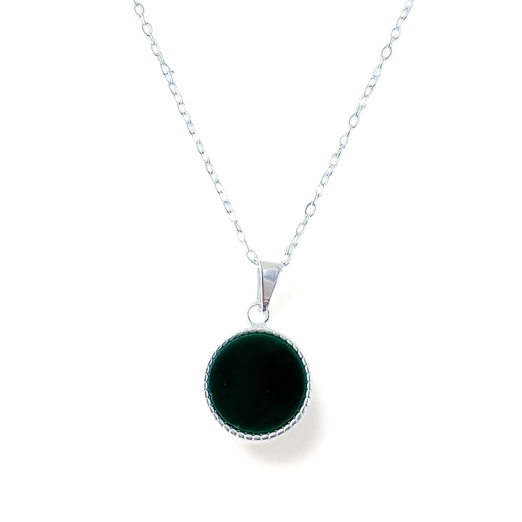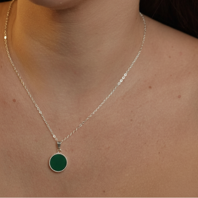 O colar redondo verde banhado a prata 925 da UNA Semijoias e Aço traz um toque de sofisticação discreta para o seu estilo. O pingente circular em verde profundo, combinado à corrente prateada de acabamento fino, cria uma peça elegante e marcante, perfeita para quem gosta de detalhes que fazem diferença no visual.
