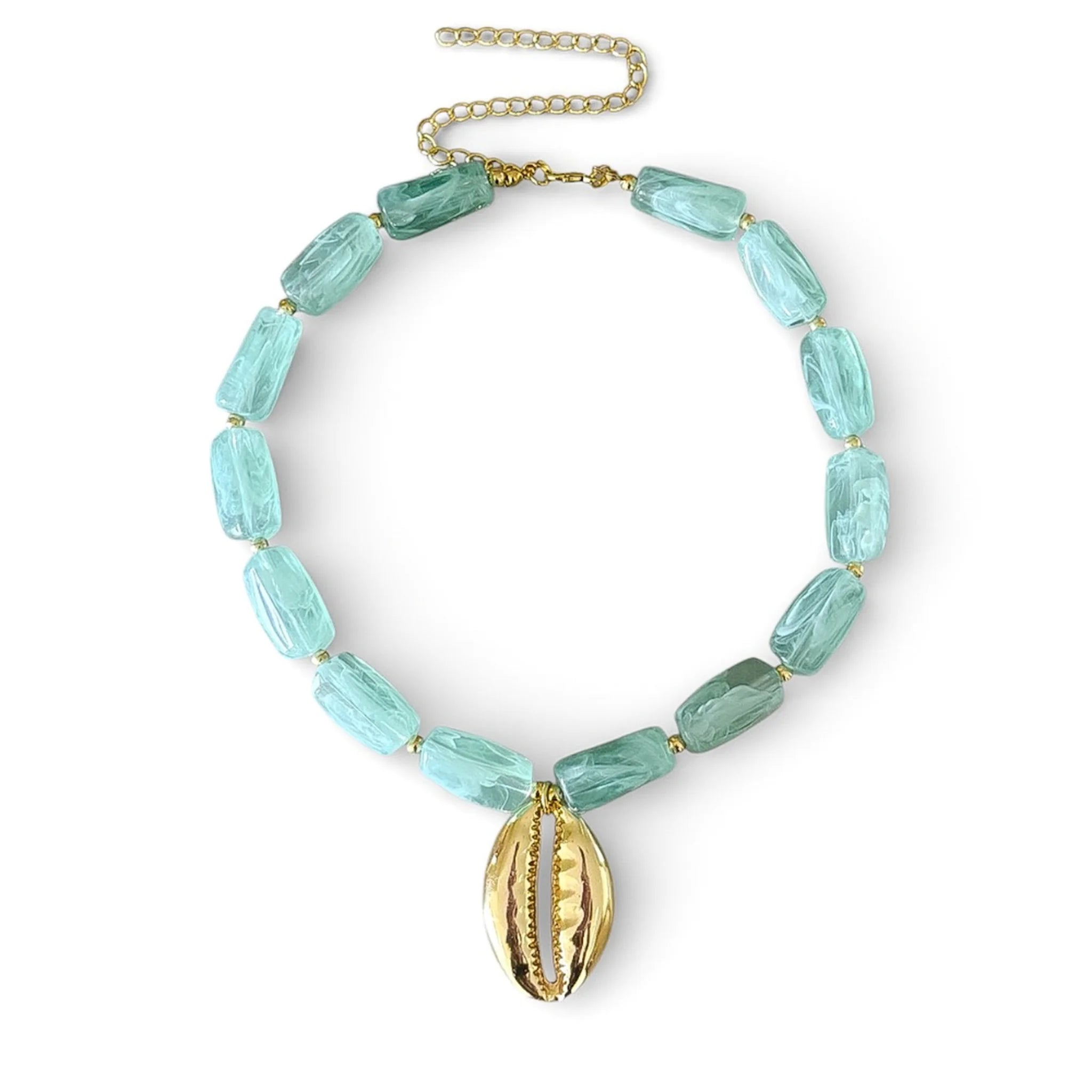 • Material e acabamento: bijuteria de alta qualidade com contas em resina azul e pingente de búzios dourado
