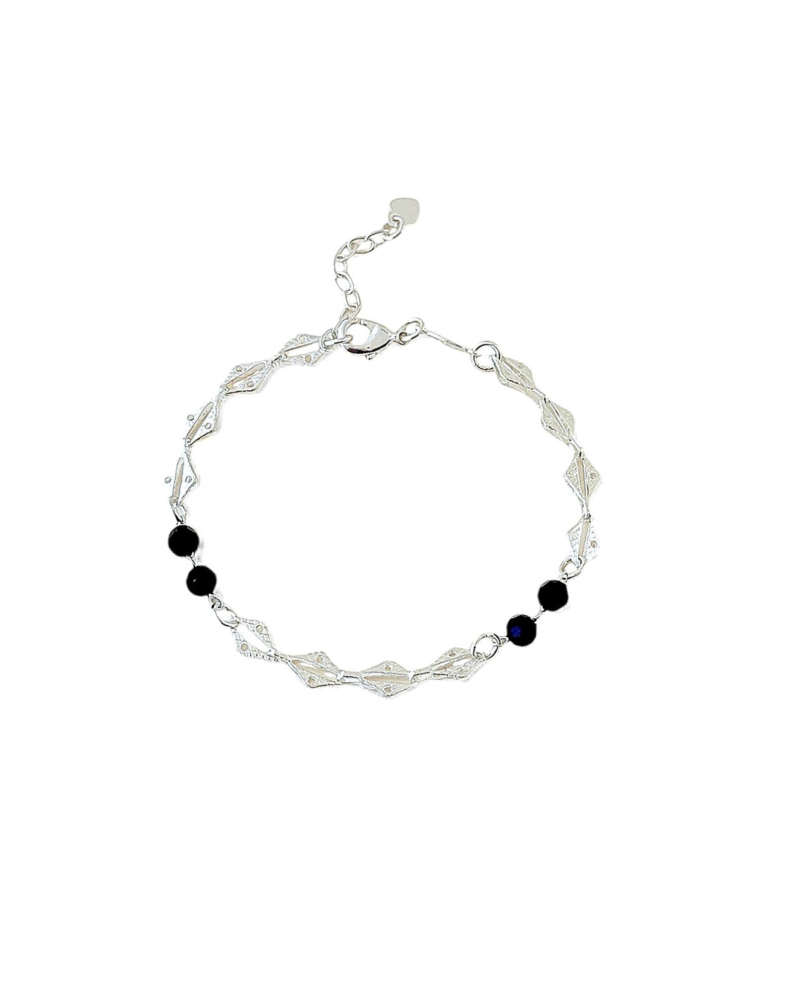 Esta pulseira de zircônia com detalhes em losango banhada a prata da UNA Semijoias e Aço foi criada para quem busca uma semijoia delicada e confortável para o dia a dia. Os elos em forma de losango, combinados às contas escuras, formam um desenho leve e moderno, adicionando estilo sem exageros.